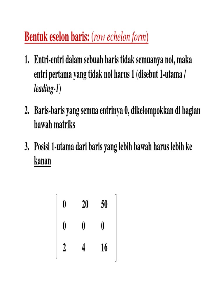 untuk "Matriks Eselon Baris Tereduksi 4X4 : Matriks Eselon Baris Dan Eselon Baris Tereduksi - Di dalam dua baris berturutan yang tidak seluruhnya nol, maka 1 utama pada baris yang lebih rendah terdapat lebih jauh ke kanan daripada 1."